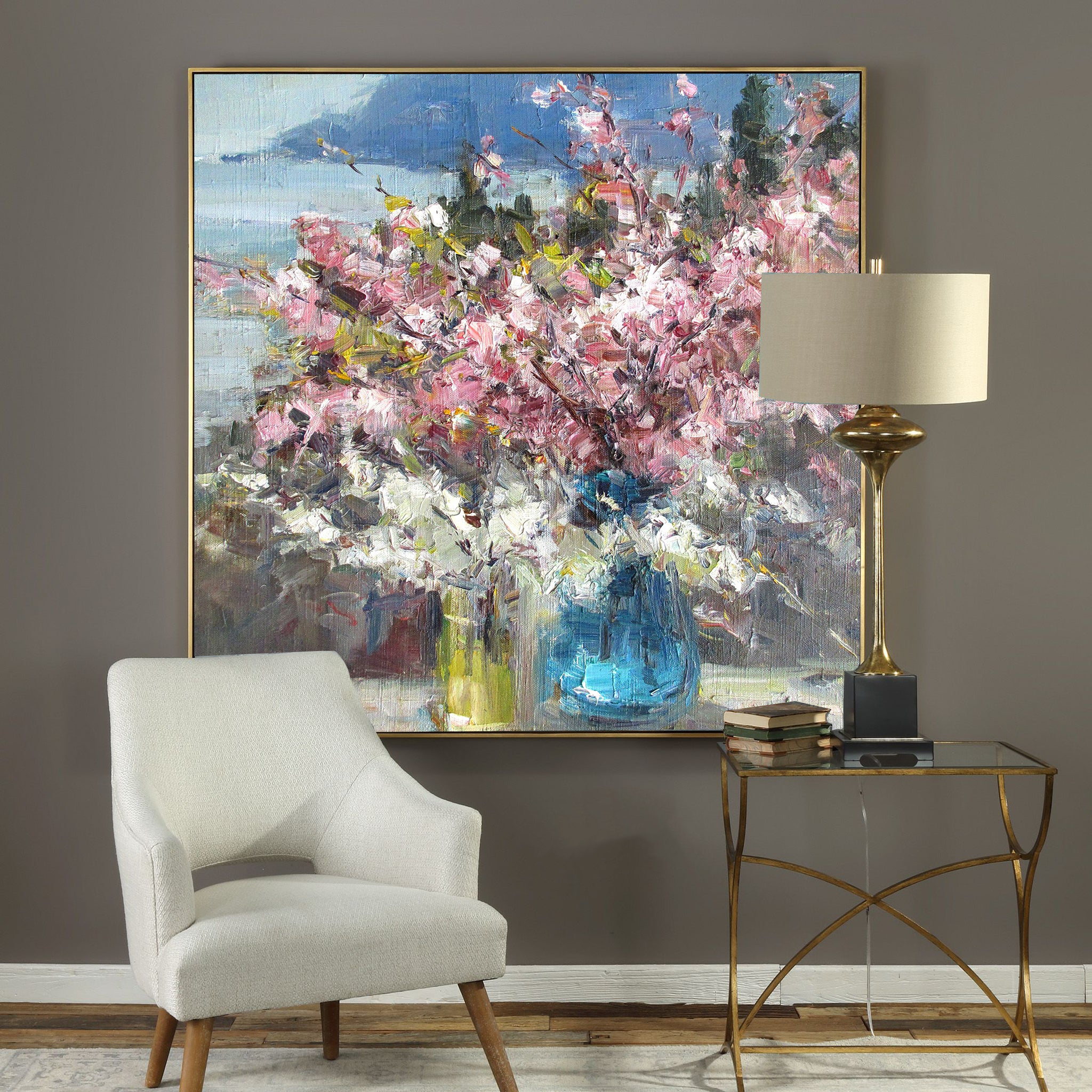 باقة زهور بيضاء في مزهرية زرقاء جميلة
